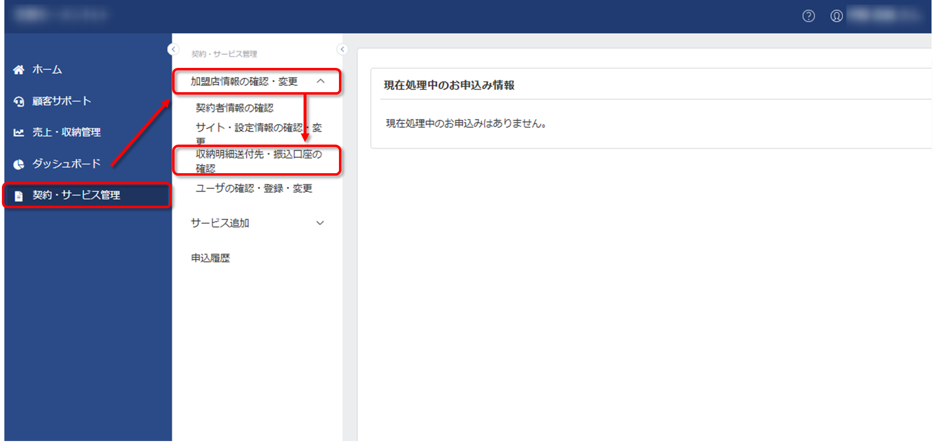 「契約・サービス管理」⇒「加盟店情報の確認・変更」⇒「収納明細送付先・振込口座の確認」の順にクリックします。