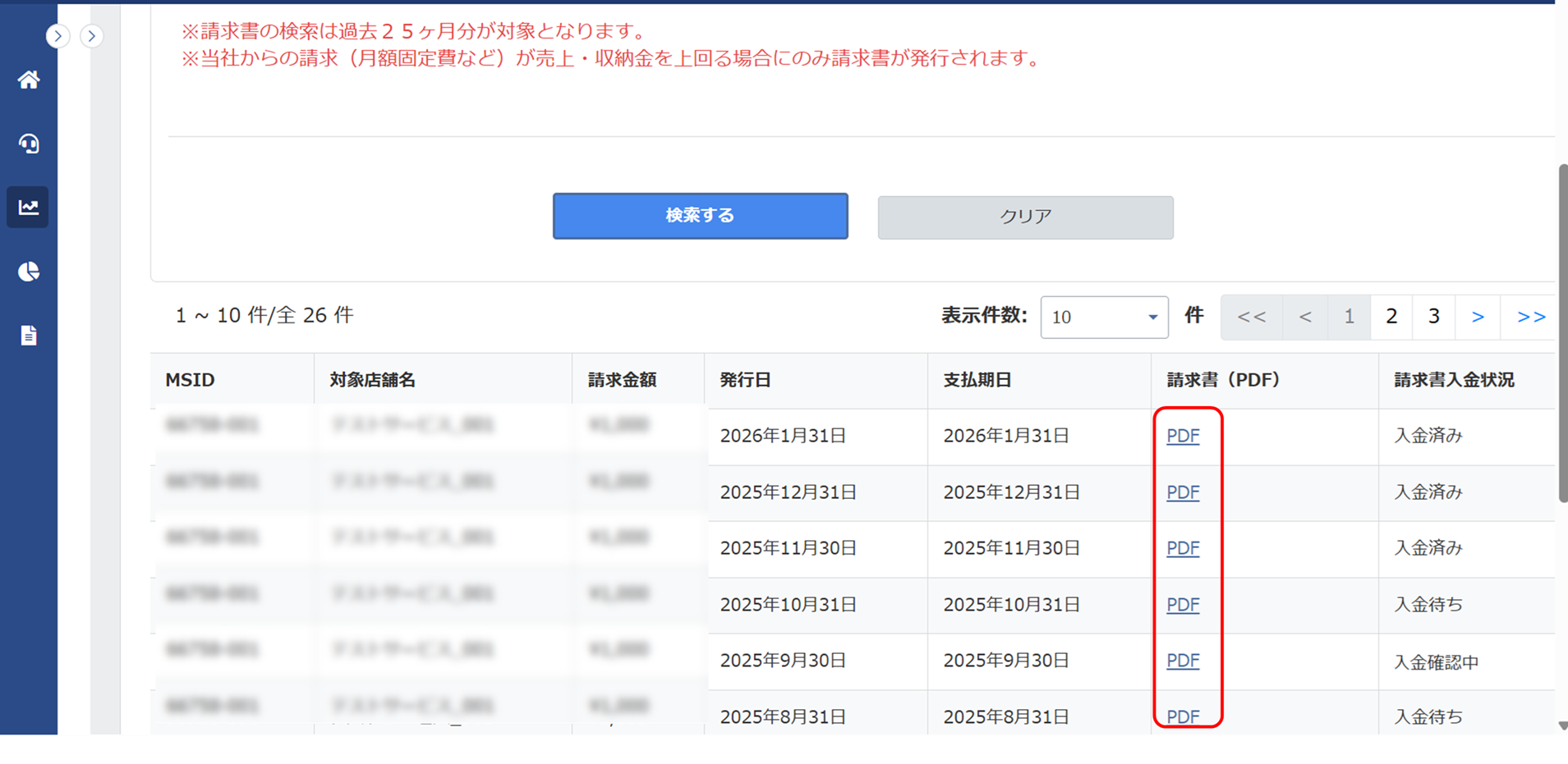「PDF」のリンクをクリックすると、請求書のPDFがダウンロードいただけます。