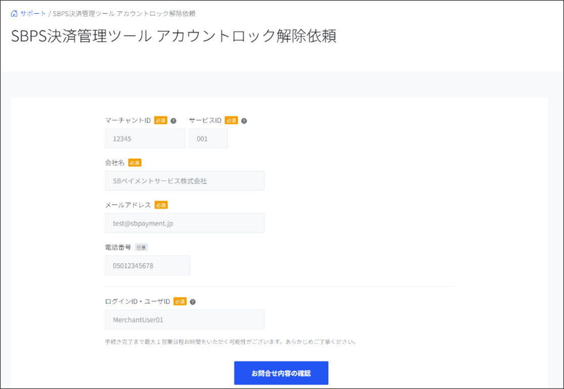 2.SBPS決済管理ツール アカウントロック解除依頼で必要な情報を入力し「お問合せ内容の確認」ボタンをクリックします
