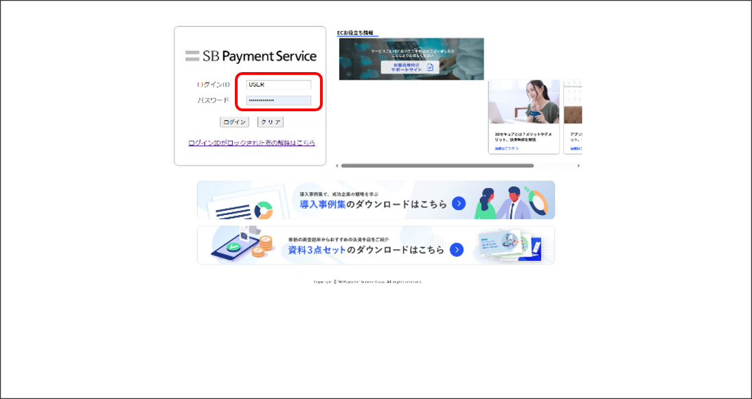 SBPS決済管理ツールから解除できない場合からアカウントロックの解除をお願いします - 管理画面のログイン情報については、加盟店様へメールでお送りしている