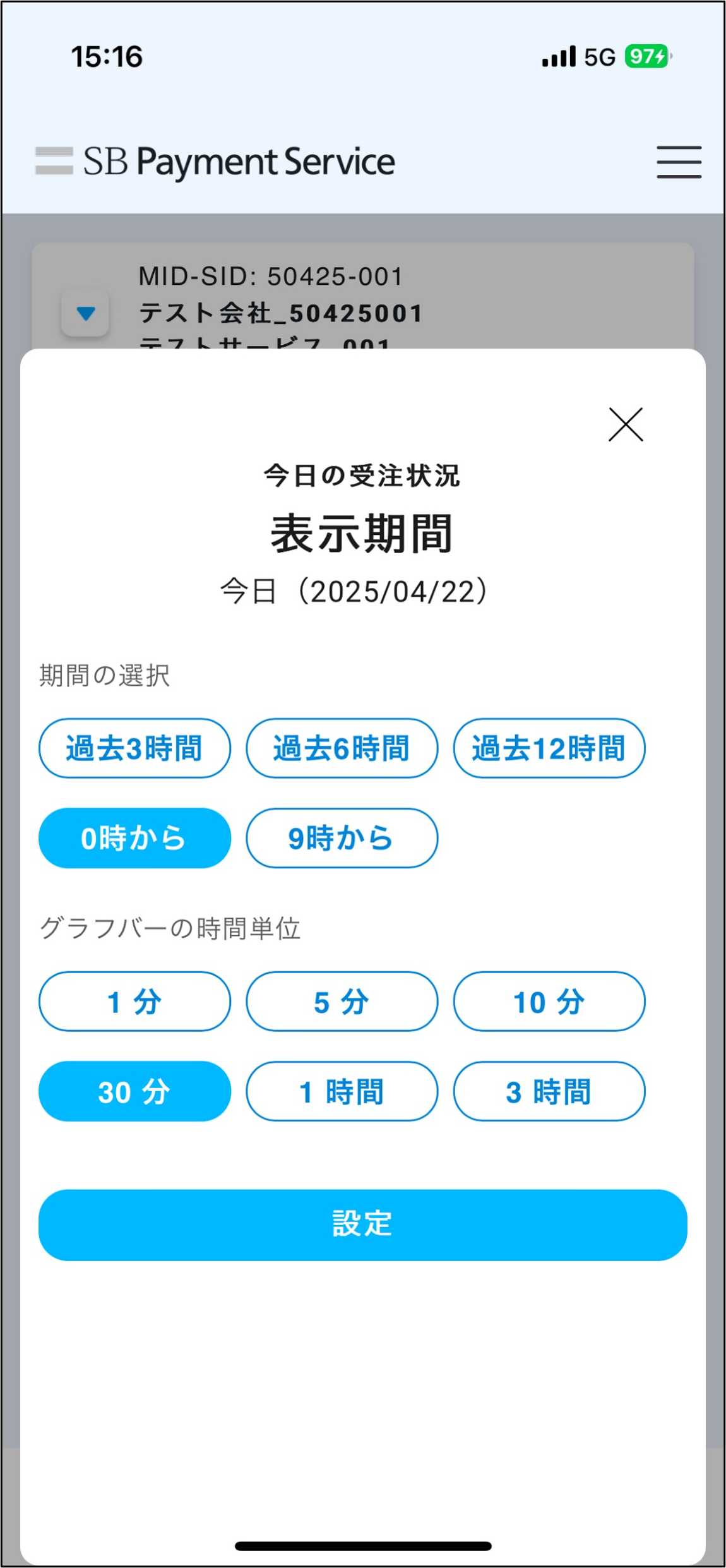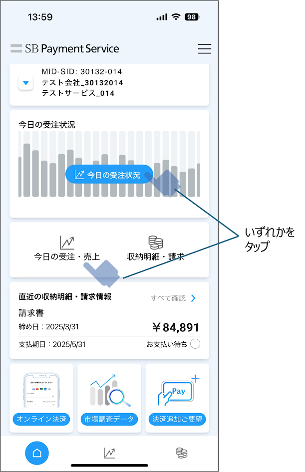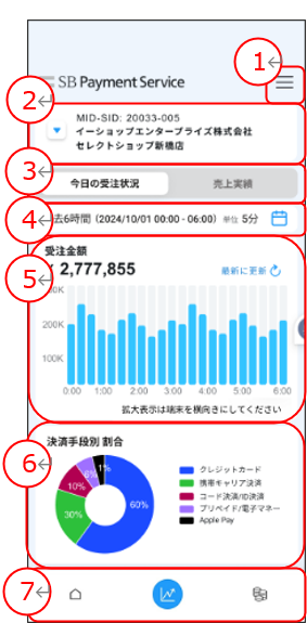 | 2 | MID-SID表示 | ログインアカウントのMSIDを表示します。 タップするとログインアカウントに紐づくMSIDが一覧で表示されます。 また、一覧画面では下記条件での検索もできます。 「MID」「SID」「加盟店名」「サービス名」 MSIDを変更すると 「今日の受注状況」「売上実績」「明細・請求書」の出力結果が 選択したMSIDのものに変わります。 |